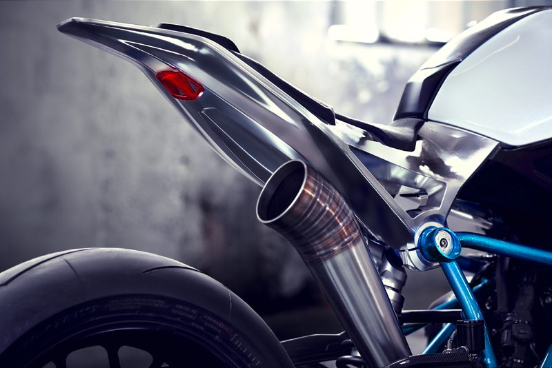 Sparkling Light White upper section appears light and purposeful.The innovative headlight uses matte LED light banks to give the Concept Roadster a distinctive “face.” Behind it, a small instrument panel provides relevant information in a stylish, compact format. The interplay between the sculpted fuel tank, seat and radiator are meant to convey a forward-looking orientation and dynamic performance. The steep tail section is made from a single piece of gloss-milled aluminum, and a neon yellow accent in the lower area of the seat adds a bold dash of color below the perforated Alcantara saddle. Additional neon yellow color accents are on the valve covers and the cooling ribs inside the side air inlets. The tubular-steel space frame is finished in Sparkling Racing Blue, and, along with the bodywork, honors the blue and white of BMW’s roundel badge. Milled aluminum air intakes, valve covers and chin spoiler add to the Concept Roadster’s high-end, exclusive appearance, while top-shelf components speak to the performance potential of the machine.